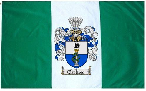 Cerineo Family Crest Flag / Coat of Arms Flag. You will receive a high quality 3' x 5' Polyester flag with two brass grommets. Proudly display your family heritage with this flag, or hang as a banner on a wall. Our flags make great gifts for birthdays, weddings, anniversaries, fathers day, mothers day, groomsmen gifts, and any other occasion