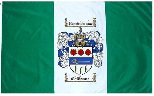 Collisone Family Crest Flag / Coat of Arms Flag. You will receive a high quality 3' x 5' Polyester flag with two brass grommets. Proudly display your family heritage with this flag, or hang as a banner on a wall. Our flags make great gifts for birthdays, weddings, anniversaries, fathers day, mothers day, groomsmen gifts, and any other occasion