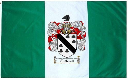 Cotterell Family Crest Flag / Coat of Arms Flag. You will receive a high quality 3' x 5' Polyester flag with two brass grommets. Proudly display your family heritage with this flag, or hang as a banner on a wall. Our flags make great gifts for birthdays, weddings, anniversaries, fathers day, mothers day, groomsmen gifts, and any other occasion