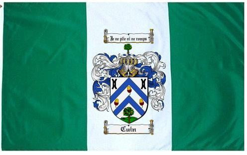 Cuin Family Crest Flag / Coat of Arms Flag. You will receive a high quality 3' x 5' Polyester flag with two brass grommets. Proudly display your family heritage with this flag, or hang as a banner on a wall. Our flags make great gifts for birthdays, weddings, anniversaries, fathers day, mothers day, groomsmen gifts, and any other occasion