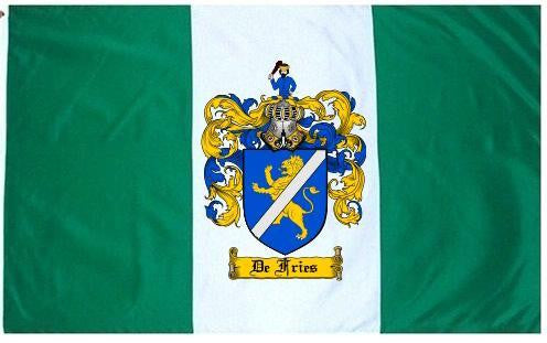 Defries Family Crest Flag / Coat of Arms Flag. You will receive a high quality 3' x 5' Polyester flag with two brass grommets. Proudly display your family heritage with this flag, or hang as a banner on a wall. Our flags make great gifts for birthdays, weddings, anniversaries, fathers day, mothers day, groomsmen gifts, and any other occasion