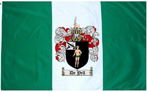 Deyell Family Crest Flag / Coat of Arms Flag. You will receive a high quality 3' x 5' Polyester flag with two brass grommets. Proudly display your family heritage with this flag, or hang as a banner on a wall. Our flags make great gifts for birthdays, weddings, anniversaries, fathers day, mothers day, groomsmen gifts, and any other occasion
