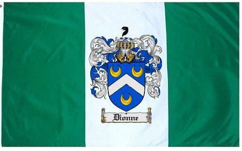 Dionne Family Crest Flag / Coat of Arms Flag. You will receive a high quality 3' x 5' Polyester flag with two brass grommets. Proudly display your family heritage with this flag, or hang as a banner on a wall. Our flags make great gifts for birthdays, weddings, anniversaries, fathers day, mothers day, groomsmen gifts, and any other occasion