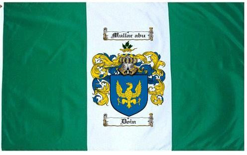 Doin Family Crest Flag / Coat of Arms Flag. You will receive a high quality 3' x 5' Polyester flag with two brass grommets. Proudly display your family heritage with this flag, or hang as a banner on a wall. Our flags make great gifts for birthdays, weddings, anniversaries, fathers day, mothers day, groomsmen gifts, and any other occasion