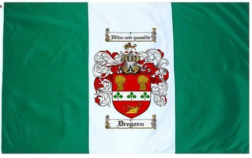 Dregorn Family Crest Flag / Coat of Arms Flag. You will receive a high quality 3' x 5' Polyester flag with two brass grommets. Proudly display your family heritage with this flag, or hang as a banner on a wall. Our flags make great gifts for birthdays, weddings, anniversaries, fathers day, mothers day, groomsmen gifts, and any other occasion
