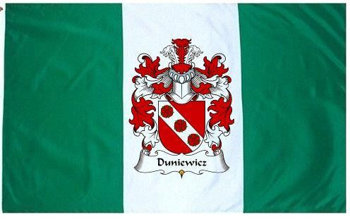 Duniewicz Family Crest Flag / Coat of Arms Flag. You will receive a high quality 3' x 5' Polyester flag with two brass grommets. Proudly display your family heritage with this flag, or hang as a banner on a wall. Our flags make great gifts for birthdays, weddings, anniversaries, fathers day, mothers day, groomsmen gifts, and any other occasion