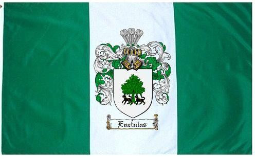 Encinias Family Crest Flag / Coat of Arms Flag. You will receive a high quality 3' x 5' Polyester flag with two brass grommets. Proudly display your family heritage with this flag, or hang as a banner on a wall. Our flags make great gifts for birthdays, weddings, anniversaries, fathers day, mothers day, groomsmen gifts, and any other occasion