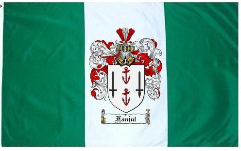 Fanjul Family Crest Flag / Coat of Arms Flag. You will receive a high quality 3' x 5' Polyester flag with two brass grommets. Proudly display your family heritage with this flag, or hang as a banner on a wall. Our flags make great gifts for birthdays, weddings, anniversaries, fathers day, mothers day, groomsmen gifts, and any other occasion