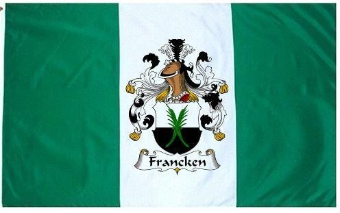 Francken Family Crest Flag / Coat of Arms Flag. You will receive a high quality 3' x 5' Polyester flag with two brass grommets. Proudly display your family heritage with this flag, or hang as a banner on a wall. Our flags make great gifts for birthdays, weddings, anniversaries, fathers day, mothers day, groomsmen gifts, and any other occasion