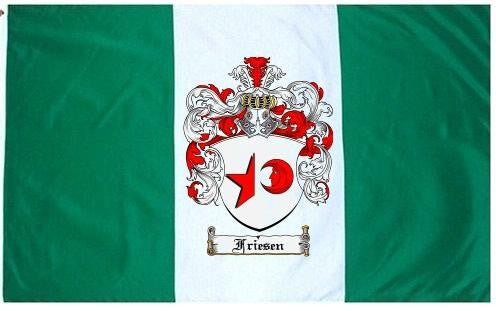 Friesen Family Crest Flag / Coat of Arms Flag. You will receive a high quality 3' x 5' Polyester flag with two brass grommets. Proudly display your family heritage with this flag, or hang as a banner on a wall. Our flags make great gifts for birthdays, weddings, anniversaries, fathers day, mothers day, groomsmen gifts, and any other occasion