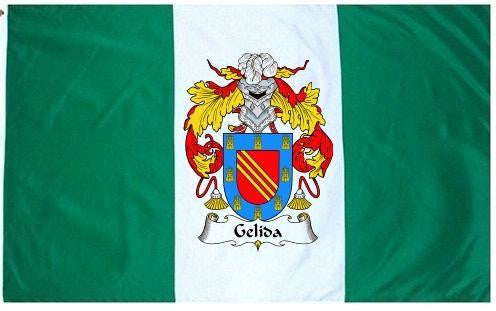 Gelida Family Crest Flag / Coat of Arms Flag. You will receive a high quality 3' x 5' Polyester flag with two brass grommets. Proudly display your family heritage with this flag, or hang as a banner on a wall. Our flags make great gifts for birthdays, weddings, anniversaries, fathers day, mothers day, groomsmen gifts, and any other occasion