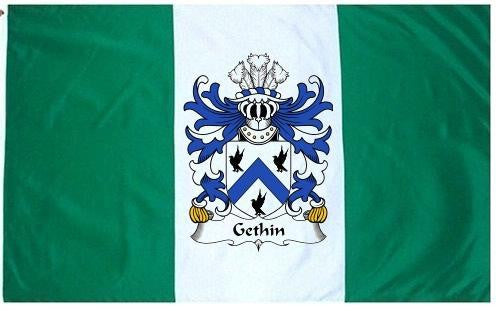 Gethin Family Crest Flag / Coat of Arms Flag. You will receive a high quality 3' x 5' Polyester flag with two brass grommets. Proudly display your family heritage with this flag, or hang as a banner on a wall. Our flags make great gifts for birthdays, weddings, anniversaries, fathers day, mothers day, groomsmen gifts, and any other occasion