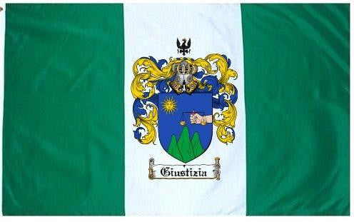 Giustizia Family Crest Flag / Coat of Arms Flag. You will receive a high quality 3' x 5' Polyester flag with two brass grommets. Proudly display your family heritage with this flag, or hang as a banner on a wall. Our flags make great gifts for birthdays, weddings, anniversaries, fathers day, mothers day, groomsmen gifts, and any other occasion