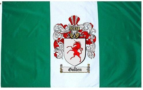 Golden Family Crest Flag / Coat of Arms Flag. You will receive a high quality 3' x 5' Polyester flag with two brass grommets. Proudly display your family heritage with this flag, or hang as a banner on a wall. Our flags make great gifts for birthdays, weddings, anniversaries, fathers day, mothers day, groomsmen gifts, and any other occasion