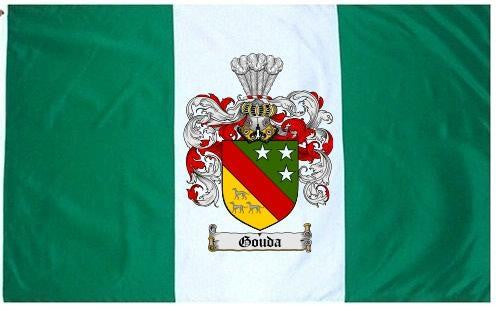 Gouda Family Crest Flag / Coat of Arms Flag. You will receive a high quality 3' x 5' Polyester flag with two brass grommets. Proudly display your family heritage with this flag, or hang as a banner on a wall. Our flags make great gifts for birthdays, weddings, anniversaries, fathers day, mothers day, groomsmen gifts, and any other occasion