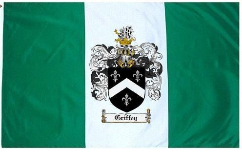 Griffey Family Crest Flag / Coat of Arms Flag. You will receive a high quality 3' x 5' Polyester flag with two brass grommets. Proudly display your family heritage with this flag, or hang as a banner on a wall. Our flags make great gifts for birthdays, weddings, anniversaries, fathers day, mothers day, groomsmen gifts, and any other occasion
