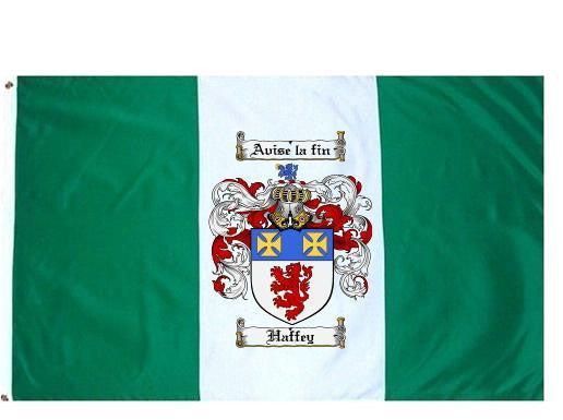 Haffey Family Crest Flag / Coat of Arms Flag. You will receive a high quality 3' x 5' Polyester flag with two brass grommets. Proudly display your family heritage with this flag, or hang as a banner on a wall. Our flags make great gifts for birthdays, weddings, anniversaries, fathers day, mothers day, groomsmen gifts, and any other occasion