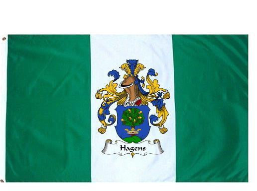 Hagens Family Crest Flag / Coat of Arms Flag. You will receive a high quality 3' x 5' Polyester flag with two brass grommets. Proudly display your family heritage with this flag, or hang as a banner on a wall. Our flags make great gifts for birthdays, weddings, anniversaries, fathers day, mothers day, groomsmen gifts, and any other occasion