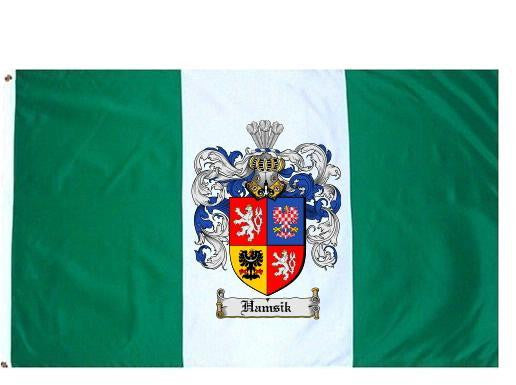 Hamsik Family Crest Flag / Coat of Arms Flag. You will receive a high quality 3' x 5' Polyester flag with two brass grommets. Proudly display your family heritage with this flag, or hang as a banner on a wall. Our flags make great gifts for birthdays, weddings, anniversaries, fathers day, mothers day, groomsmen gifts, and any other occasion