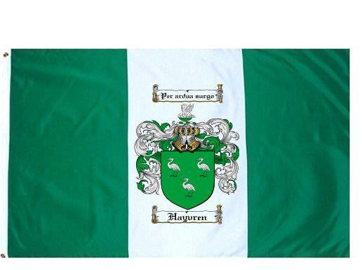Hayvren Family Crest Flag / Coat of Arms Flag. You will receive a high quality 3' x 5' Polyester flag with two brass grommets. Proudly display your family heritage with this flag, or hang as a banner on a wall. Our flags make great gifts for birthdays, weddings, anniversaries, fathers day, mothers day, groomsmen gifts, and any other occasion