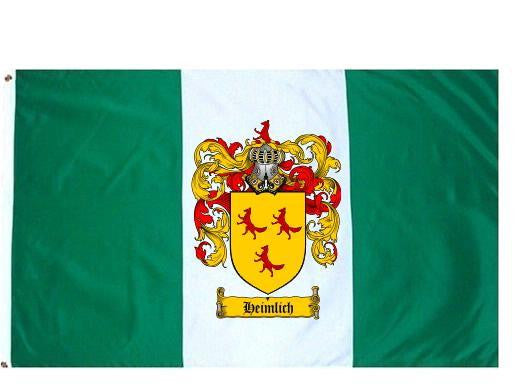 Heimlich Family Crest Flag / Coat of Arms Flag. You will receive a high quality 3' x 5' Polyester flag with two brass grommets. Proudly display your family heritage with this flag, or hang as a banner on a wall. Our flags make great gifts for birthdays, weddings, anniversaries, fathers day, mothers day, groomsmen gifts, and any other occasion