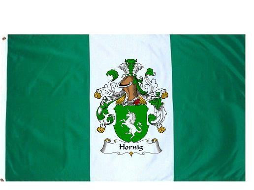 Hornig Family Crest Flag / Coat of Arms Flag. You will receive a high quality 3' x 5' Polyester flag with two brass grommets. Proudly display your family heritage with this flag, or hang as a banner on a wall. Our flags make great gifts for birthdays, weddings, anniversaries, fathers day, mothers day, groomsmen gifts, and any other occasion