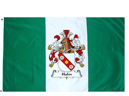 Huhn Family Crest Flag / Coat of Arms Flag. You will receive a high quality 3' x 5' Polyester flag with two brass grommets. Proudly display your family heritage with this flag, or hang as a banner on a wall. Our flags make great gifts for birthdays, weddings, anniversaries, fathers day, mothers day, groomsmen gifts, and any other occasion
