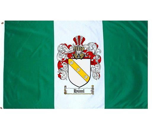 Huml Family Crest Flag / Coat of Arms Flag. You will receive a high quality 3' x 5' Polyester flag with two brass grommets. Proudly display your family heritage with this flag, or hang as a banner on a wall. Our flags make great gifts for birthdays, weddings, anniversaries, fathers day, mothers day, groomsmen gifts, and any other occasion