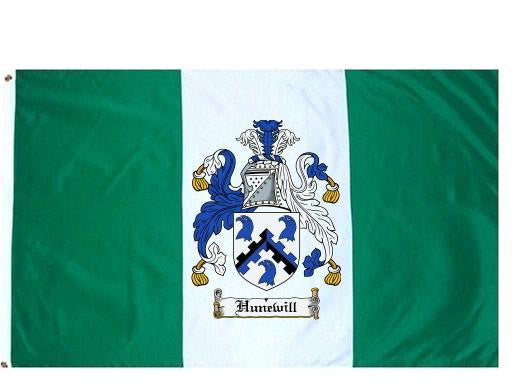 Hunewill Family Crest Flag / Coat of Arms Flag. You will receive a high quality 3' x 5' Polyester flag with two brass grommets. Proudly display your family heritage with this flag, or hang as a banner on a wall. Our flags make great gifts for birthdays, weddings, anniversaries, fathers day, mothers day, groomsmen gifts, and any other occasion