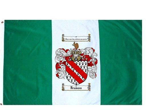 Ireson Family Crest Flag / Coat of Arms Flag. You will receive a high quality 3' x 5' Polyester flag with two brass grommets. Proudly display your family heritage with this flag, or hang as a banner on a wall. Our flags make great gifts for birthdays, weddings, anniversaries, fathers day, mothers day, groomsmen gifts, and any other occasion