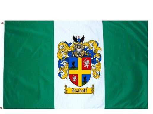 Isacoff Family Crest Flag / Coat of Arms Flag. You will receive a high quality 3' x 5' Polyester flag with two brass grommets. Proudly display your family heritage with this flag, or hang as a banner on a wall. Our flags make great gifts for birthdays, weddings, anniversaries, fathers day, mothers day, groomsmen gifts, and any other occasion