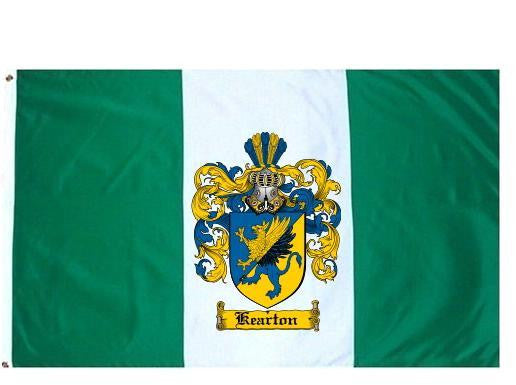 Kearton Family Crest Flag / Coat of Arms Flag. You will receive a high quality 3' x 5' Polyester flag with two brass grommets. Proudly display your family heritage with this flag, or hang as a banner on a wall. Our flags make great gifts for birthdays, weddings, anniversaries, fathers day, mothers day, groomsmen gifts, and any other occasion