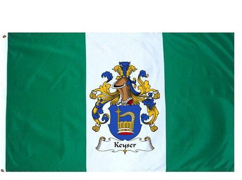 Keyser Family Crest Flag / Coat of Arms Flag. You will receive a high quality 3' x 5' Polyester flag with two brass grommets. Proudly display your family heritage with this flag, or hang as a banner on a wall. Our flags make great gifts for birthdays, weddings, anniversaries, fathers day, mothers day, groomsmen gifts, and any other occasion
