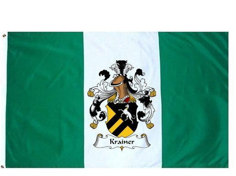 Krainer Family Crest Flag / Coat of Arms Flag. You will receive a high quality 3' x 5' Polyester flag with two brass grommets. Proudly display your family heritage with this flag, or hang as a banner on a wall. Our flags make great gifts for birthdays, weddings, anniversaries, fathers day, mothers day, groomsmen gifts, and any other occasion