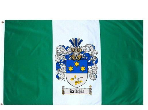 Krischke Family Crest Flag / Coat of Arms Flag. You will receive a high quality 3' x 5' Polyester flag with two brass grommets. Proudly display your family heritage with this flag, or hang as a banner on a wall. Our flags make great gifts for birthdays, weddings, anniversaries, fathers day, mothers day, groomsmen gifts, and any other occasion