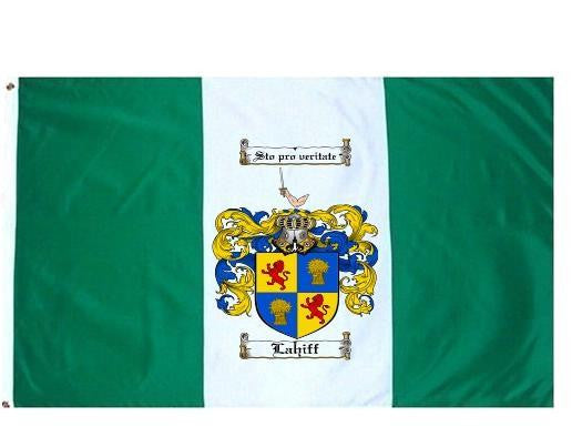 Lahiff Family Crest Flag / Coat of Arms Flag. You will receive a high quality 3' x 5' Polyester flag with two brass grommets. Proudly display your family heritage with this flag, or hang as a banner on a wall. Our flags make great gifts for birthdays, weddings, anniversaries, fathers day, mothers day, groomsmen gifts, and any other occasion