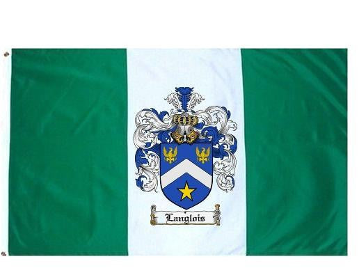 Langlois Family Crest Flag / Coat of Arms Flag. You will receive a high quality 3' x 5' Polyester flag with two brass grommets. Proudly display your family heritage with this flag, or hang as a banner on a wall. Our flags make great gifts for birthdays, weddings, anniversaries, fathers day, mothers day, groomsmen gifts, and any other occasion