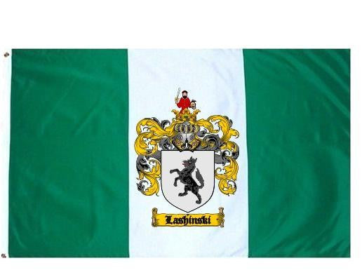 Lashinski Family Crest Flag / Coat of Arms Flag. You will receive a high quality 3' x 5' Polyester flag with two brass grommets. Proudly display your family heritage with this flag, or hang as a banner on a wall. Our flags make great gifts for birthdays, weddings, anniversaries, fathers day, mothers day, groomsmen gifts, and any other occasion