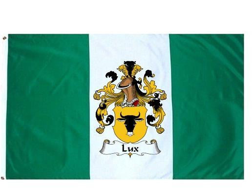 Lux Family Crest Flag / Coat of Arms Flag. You will receive a high quality 3' x 5' Polyester flag with two brass grommets. Proudly display your family heritage with this flag, or hang as a banner on a wall. Our flags make great gifts for birthdays, weddings, anniversaries, fathers day, mothers day, groomsmen gifts, and any other occasion