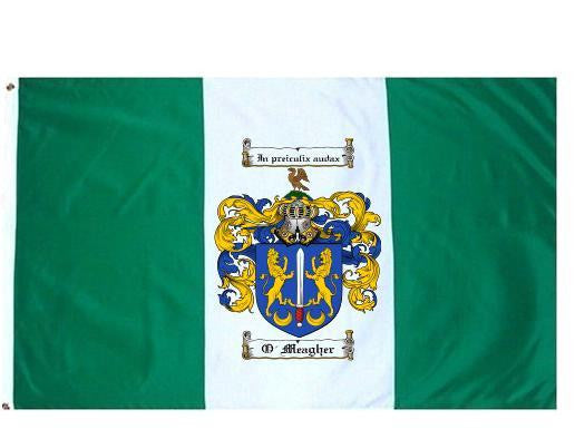 O'Meagher Family Crest Flag / Coat of Arms Flag. You will receive a high quality 3' x 5' Polyester flag with two brass grommets. Proudly display your family heritage with this flag, or hang as a banner on a wall. Our flags make great gifts for birthdays, weddings, anniversaries, fathers day, mothers day, groomsmen gifts, and any other occasion