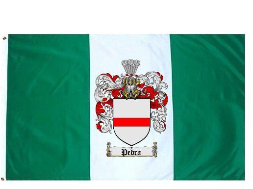 Pedra Family Crest Flag / Coat of Arms Flag. You will receive a high quality 3' x 5' Polyester flag with two brass grommets. Proudly display your family heritage with this flag, or hang as a banner on a wall. Our flags make great gifts for birthdays, weddings, anniversaries, fathers day, mothers day, groomsmen gifts, and any other occasion