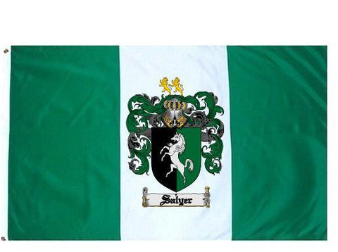 Salyer Family Crest Flag / Coat of Arms Flag. You will receive a high quality 3' x 5' Polyester flag with two brass grommets. Proudly display your family heritage with this flag, or hang as a banner on a wall. Our flags make great gifts for birthdays, weddings, anniversaries, fathers day, mothers day, groomsmen gifts, and any other occasion