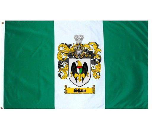 Sham Family Crest Flag / Coat of Arms Flag. You will receive a high quality 3' x 5' Polyester flag with two brass grommets. Proudly display your family heritage with this flag, or hang as a banner on a wall. Our flags make great gifts for birthdays, weddings, anniversaries, fathers day, mothers day, groomsmen gifts, and any other occasion