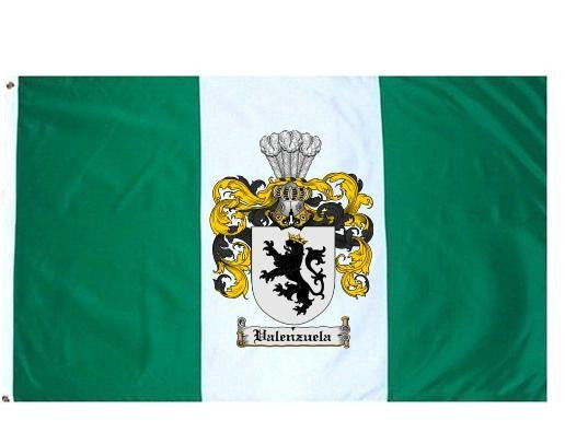 Valenzuela Family Crest Flag / Coat of Arms Flag. You will receive a high quality 3' x 5' Polyester flag with two brass grommets. Proudly display your family heritage with this flag, or hang as a banner on a wall. Our flags make great gifts for birthdays, weddings, anniversaries, fathers day, mothers day, groomsmen gifts, and any other occasion